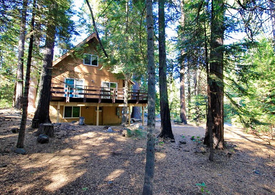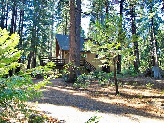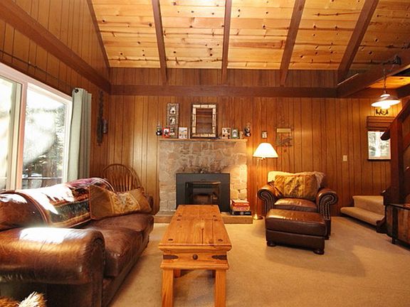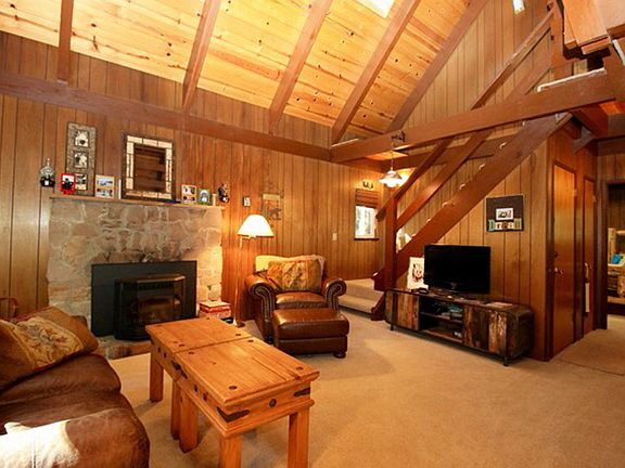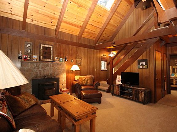 This cozy Big Trees Village chalet is situated on a gorgeous level lot with granite rock outcroppings and old growth conifers. Dramatic cathedral ceilings with open beams and pine decking. Itâs easy to heat with propane central heat and a pellet stove inserted into the real rock fireplace. Light and bright with updated windows, skylights and roof replaced in approximately 2009.