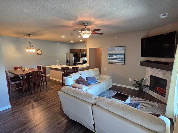 Walk-in closetBeautiful wood laminate floorsWide-open living spaceQuartz countertopsSubway tile backsplashPeninsula style breakfast barNice patio