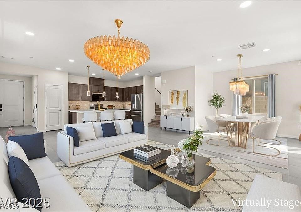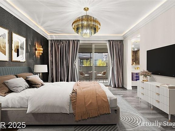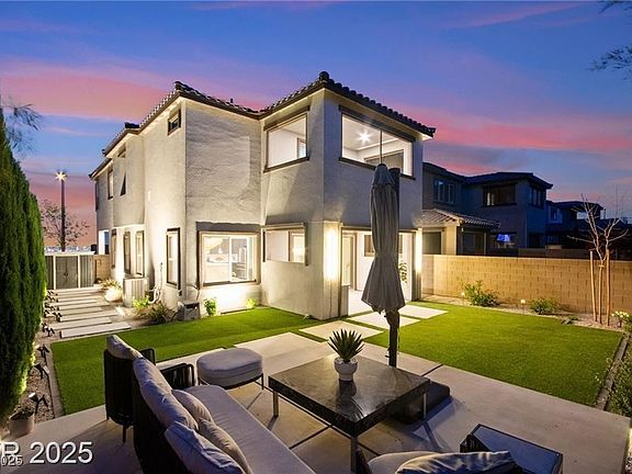This exceptional home in the sought after Summerlin gated community offers unparalleled elegance and an array of premium upgrades. Positioned on a corner lot with breathtaking Strip and mountain views, the home boasts Restoration Hardware light fixtures and window treatments, large tile flooring, and new LVP flooring. The chef’s kitchen features a GE Café refrigerator, Reverse osmosis system, and Robam ducted range hood with hands-free operation. The stunning primary suite includes custom crown molding with indirect LED lighting and a private, tiled balcony. The redesigned primary bathroom features a custom closet with illuminated built-ins, ample storage, and a vanity set. The second and third bedrooms include fantastic strip views. The backyard is a highlight w/ over $40K in renovations, including an enclosed patio with hurricane proof blinds, kitchen, bamboo and cypress trees. 2 sets of solar; one is completely paid off and 1 PPA w/ payments at $77/mo total, and so MUCH more to see!