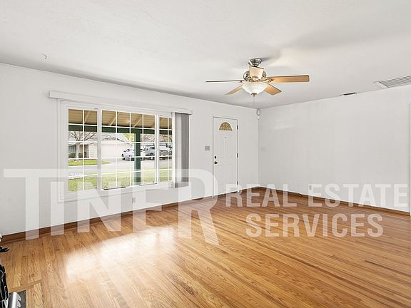 French doors lead to the backyard, seamlessly connecting indoor and outdoor living spaces. The home also features ceiling fans, a whole house fan, and central heat for year-round comfort. The attached garage includes laundry hookups for added convenience. A covered front patio and large windows throughout the home further enhance its appeal.
