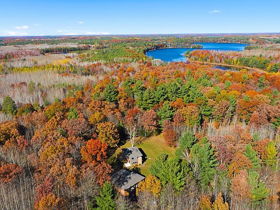 Darling 2 bedroom year round home or cabin. Tucked away on a private 9.93 acre setting surrounded by deer & wildlife. Awesome 25x40 garage with an attached 16x34 rec/bonus room that's perfect for entertaining, guest overflow, workshop or office. New 29x12 deck, concrete patio, entry doors, patio door & shed doors, new roof, stainless kitchen appliances, carpet & gas forced air furnace. Stay warm and comfy in the spacious 12x21 family room with a cozy wood burning fireplace. Great location near multiple lakes, trails & the Clam River. Make this beautiful, peaceful, paradise your own!