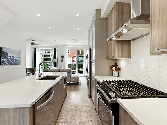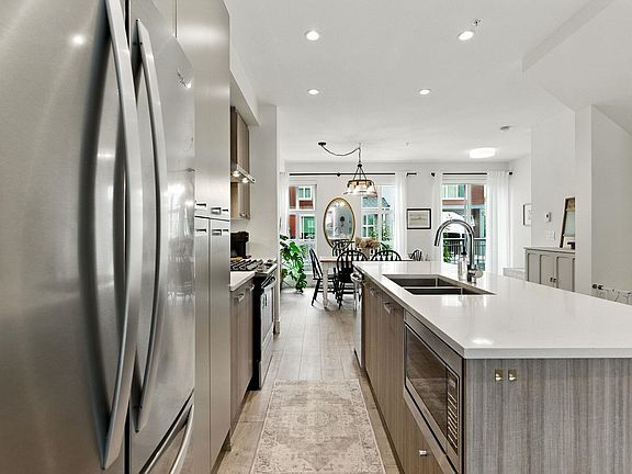 Welcome to your home at Creekside! This beautifully finished 3 bedroom, 3 bathroom townhome offers 1,432 sqft of bright and functional living space. The open main floor features 9-foot ceilings, a spacious living and dining area, a gourmet kitchen with quartz countertops, a spacious island, stainless steel appliances, and ample storage. Thoughtful custom millwork provides style and functionality and gives this home a unique touch. Upstairs you'll find 3 generous bedrooms, including a primary suite with walk-in closet and ensuite. Enjoy a private outdoor space, perfect for relaxing or entertaining, plus the convenience of an attached garage. Nestled beside Siegel Creek, this sought-after community combines natural surroundings with close proximity to schools, shopping, parks, and transit.