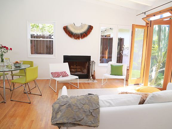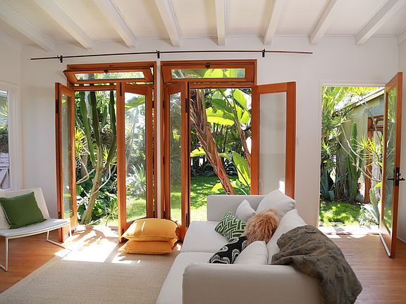 This two-bedroom / one-bathroom / plus studio bungalow home is designed with thought and to perfection, capturing the ocean breezes and bathed in California sunshine. Every room has French doors opening to its lush tropical gardens. The ceilings are vaulted with exposed beams, the floors are hardwood, the wood-burning fireplace is perfect, the kitchen has unique copper countertops, and the bath is luxurious travertine marble. Swing open your doors and you're one with nature, in your tropical hideaway in the heart of Venice. It's serenity, just a block from all that Venice offers. And unusual for any part of the City, but especially areas around the beach, this home has plenty of on and off-site parking, no matter the time of day. You enjoy soaking up the sun, working and playing in your spacious studio, reveling in the private gardens and entertaining family and friends in the indoor/outdoor flow.