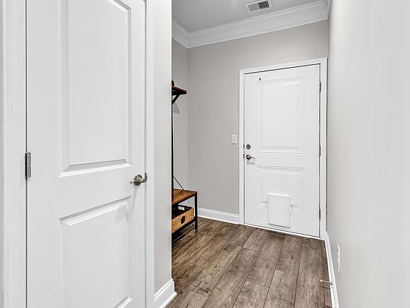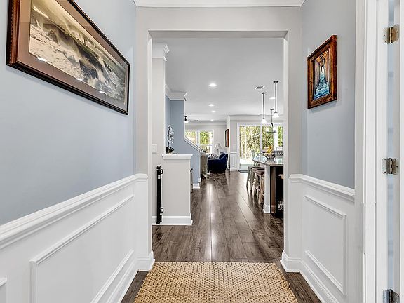 This exceptional residence is situated on a premium wooded lot within the highly sought-after Berkshire Forest community. The meticulously designed Castle Rock floor plan encompasses three bedrooms, three bathrooms, an office, and a total of 2,383 heated square feet of naturally illuminated living space. The property features a spacious front porch, ideal for fostering neighborly connections. Upon entering, one is greeted by a welcoming foyer that leads to a dedicated office equipped with French doors, providing an excellent environment for remote work. A hallway adjacent to the foyer leads to a mudroom, which connects to the two-car garage, the main bathroom, and the first-floor bedroom. The kitchen, which is open to the dining room and great room, offers picturesque views of the private backyard. It is equipped with upgraded cabinetry, stainless steel appliances, and a wall oven, seamlessly flowing into the dining area. The great room is designed with large windows that allow ample natural light, complemented by a door that provides access to the laundry room and the primary bedroom. The upper level of the home features a spacious family room, a third bedroom, a full bathroom, and additional storage space. This residence includes various enhancements such as granite countertops, crown molding, and wainscoting, ceiling fans, among other amenities. The property is bordered by woodlands on the back and right sides, providing an ideal setting for family outings or relaxation after a demanding day. Residents of Berkshire Forest benefit from resort-style amenities that include two outdoor swimming pools, a lazy river, a playground, a splash pad, a basketball court, bocce ball, pickleball courts, and walking trails. The clubhouse is equipped with a fitness center, a kitchen, a library, and the services of a full-time activities coordinator.