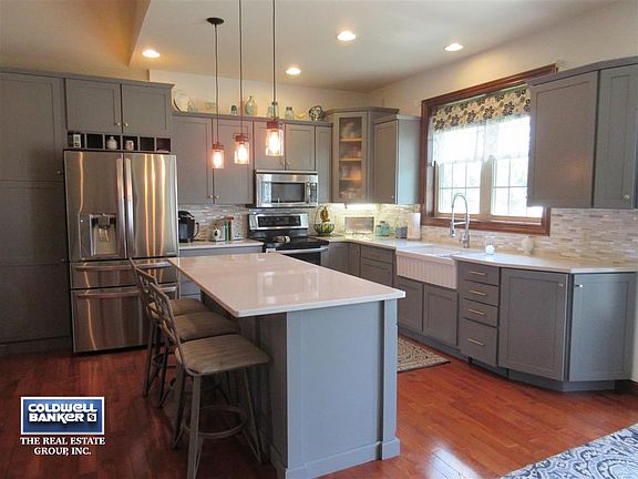 Water access to Eagle Pointe Lake...Beautiful 4 bedroom, 3 bath executive style ranch situated on 1.04 acres and features open concept floor plan, architectural volume ceilings, floor-to-ceiling stone fireplace with hand-crafted pine slab mantel, maple floors & doors, lower level kitchenette, walk out basement and much more! Newly updated kitchen boasts modern gray cabinetry, quartz counter tops with an apron farm sink, glass mosaic backsplash and stainless steel appliances.