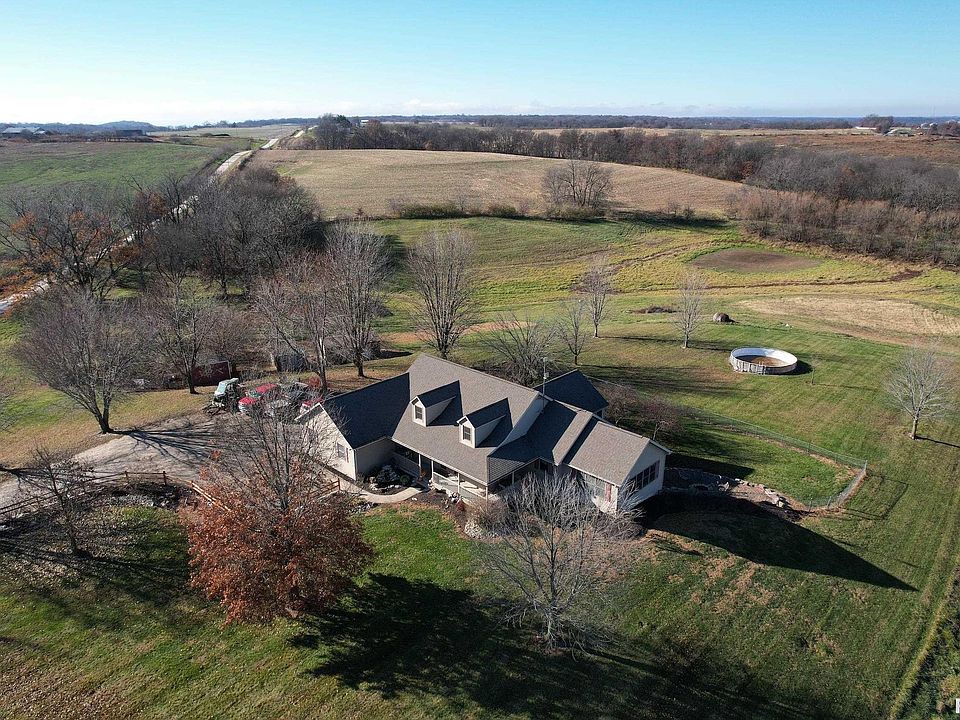 This 4,400 sq ft home sits on 14 acres of rolling pasture in Pike County and offers a spacious layout with multiple functional living areas. The main level features hardwood flooring throughout, an open kitchen and dining area, and a living room with wraparound windows that overlook the pond and pasture. The main floor also includes an office, an additional bedroom, a laundry, and a mudroom with direct access to the attached garage, and a primary bedroom suite with ample space and natural light. A three-season room adds additional living space and includes a small sitting deck with elevated views of the property. The lower level is fully finished and includes a large secondary living room with a walkout to a covered patio and the fenced backyard. Three bedrooms and a full bathroom are located in the basement, along with multiple storage rooms. The layout allows for comfortable everyday living as well as space for guests or extended family. The 14-acre tract consists of rolling topography, boundary fencing, open pasture, and two ponds, one of which is currently dry. The acreage provides room for livestock, recreation, or general land use. The home is positioned to take advantage of views across the property while maintaining privacy. Located in rural Pike County, this property is close to Hannibal, Quincy, and Jacksonville, offering access to regional services while retaining a quiet country setting.