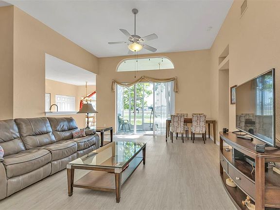 RARELY AVAILABLE Nottingham floor plan with gorgeous golf course views in the gated golf course/active resort of highly desirable Kings Gate, a 55+ community that is NOT in flood zone and in evacuation zone D (has never been under an evacuation order). Nice mango tree out back and avocado tree in front - talk about convenient! Great curb appeal and as you step inside you'll notice the large living room with very high ceilings and a gorgeous view of the golf course that also helps provide plenty of natural daylight. Roof from 2022, AC 2017 and HWH 2021 - roll down hurricane protection for front and back. This sought after floorplan features a guest bathroom that has an entrance from the foyer and from the guest bedroom - providing an ensuite. In addition to the large living room there is a den or family room that is to the front right of the house and it features a murphy bed (contents of home are negotiable). Guest bedroom is to front left of home and master is back right - providing tremendous privacy. Kitchen is spacious with plenty of counter and cabinet space and opens up nicely to living room. No question you're going to love having your cup of coffee with a view - and may choose that from your lanai to enjoy a cool breeze. And if you haven't been to Kings Gate before - you're going to love the options for activity (Olympic size heated swimming pool and spa, tennis courts, pickle ball, lawn bowling, shuffle board, bocce, horseshoes, gym, billiards, library, euchre, bingo, bridge, Texas hold em, poker, mahjong and more). The onsite AND NEWLY REMODELED Lions Den restaurant and bar is super convenient and also offers Tuesday night Karaoke and monthly trivia contests. Many residents love the fact that they are just a golf cart ride away from the shopping plaza that provides you access to grocery store, drug store, bank, restaurants and shopping. Want to explore outside of Kings Gate – you are minutes away from the restaurants and shops of downtown Punta Gorda and Fisherman's village. And if you want to explore more of Florida's fun spots you’re near I75 to quickly head north or south. An AWESOME floorplan with a gorgeous golf/water view in highly desirable Kings Gate needs to be experienced. Call today for a private showing and a golf cart tour of the community/amenities.