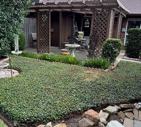 Covered patio-pergolaLots of pretty cabinetsSpa-like walk-in seated shower-tubEfficient roomy u-shaped kitchenLush landscapingWalk-in closetTiled corner wbfp