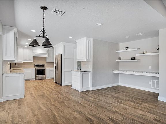 This home is a complete and rigorous remodel and rebuild. Everything is new the list begins with new windows, heat and air, electrical, plumbing. New appliances, wood tile floors through out but carpet in bedrooms. The cabinets and all woodwork in the home are all custom built. This includes kitchen and both bathrooms, with tiled surround and showers. The pantry is an addition as is the extended and re designed laundry area and bar area which has floating shelves. The fireplace is a complete redo as it had been removed, it is a massive limestone fireplace with a mantel that ties in with design in the kitchen. Granite countertops throughout, repainted inside and out also newly sheet rocked and LED lights throughout. Home has been landscaped and has a large back yard. New Garage doors and lifts, extra side parking and a storm shelter under back patio. New electrical, new plumbing, new fixtures.