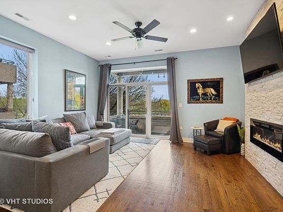 ****O.H. CANCELLED - PROPERTY IS UNDER CONTRACT! Immaculate and bright 3 bed/2 bath condo in mid-rise elevator building with heated attached garage parking included! Minutes from the heart of Lincoln Square and Andersonville/Edgewater, this light-filled and spacious open concept home boasts a unique, extra wide floor plan. The large living room features a gorgeous white stone accent electric fireplace wall, and accesses a large private balcony with expansive east facing views. The kitchen features stainless steel appliances, shaker style cabinets, granite countertops with ample counter space and an 11' breakfast bar that opens to a separate dining room which can accommodate a large table. The split bedroom floor plan is ideal, and features a king-sized primary bedroom with a spa like ensuite bath boasting heated floors, a stylish double vanity with quartz counters, a deep soaking tub and a separate frameless glass shower with large rain head and natural stone tiled basin. The other side of the home features two additional bedrooms great for office/guests/workout space, plus a full hall bathroom with frameless glass shower. Additional highlights include in unit laundry, nine foot ceilings, added recessed lighting and custom fixtures, solid hardwood floors plus additional storage off the garage. Assessments include internet. A must see!
