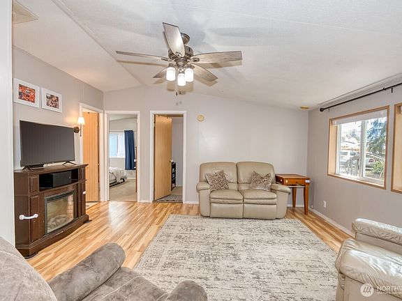 Delightful home on a dreamy lot in Avallena Woods Park. Move right into this well-kept 3BR 2BA home, w/several updates & a great floor plan. Fresh interior paint, flooring, vanities, large kitchen w/wood cabinets, butcher island, built-in desk or coffee bar, walk-in pantry, dining nook & access to back of the lot. Primary suite w/attached full bath & walk-in closet, & so many homey details. Outdoor is an oasis--large deck, naturally landscaped, firepit, BBQ patio area, lawn space, decorative & privacy fencing, large storage shed, & tons of parking, all tucked on a corner amongst the trees on leased land! Park space rent of $550/month incudes water & septic, & PUD power helps keep costs low too. No age restrictions! Easy rural living feel!