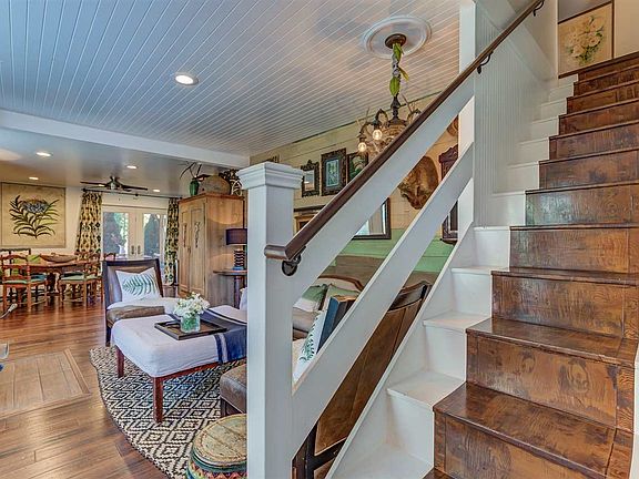 Discover this quaint oasis tucked behind a privacy hedge, located in the Old Mill district of McCloud. Off the beaten path, but easily accessible from downtown by car or footpath, this is the perfect locale for your mountain life. This home has been lovingly updated, including foundation work, electrical, plumbing, flooring, windows, siding, landscaping and more. Upon entry, you're welcomed into a bright and airy foyer which leads to an impressive, yet cozy open living/dining/kitchen space. The remodeled kitchen includes Corian countertops, a large island, tile backsplash, farmhouse sink & laundry closet. Downstairs boasts two bedrooms & a Jack-and-Jill bath complete with the original clawfoot tub. Upstairs, you'll find another large bedroom and gorgeous custom bathroom along with plenty of extra storage closets. Meander out back through the glass French doors and be delighted by the patio shrouded with shade coverings & screens, designed perfectly for dining alfresco on those warm summer evenings. Extensive landscaping on an auto-irrigation system, a large storage shed, covered carport & woodshed round out this impressive homestead. Vacation rental license adds income potential.