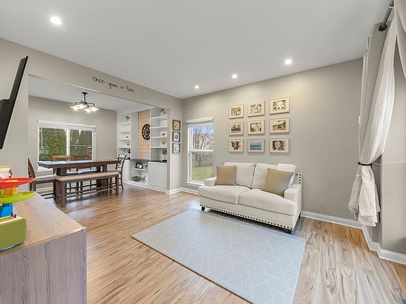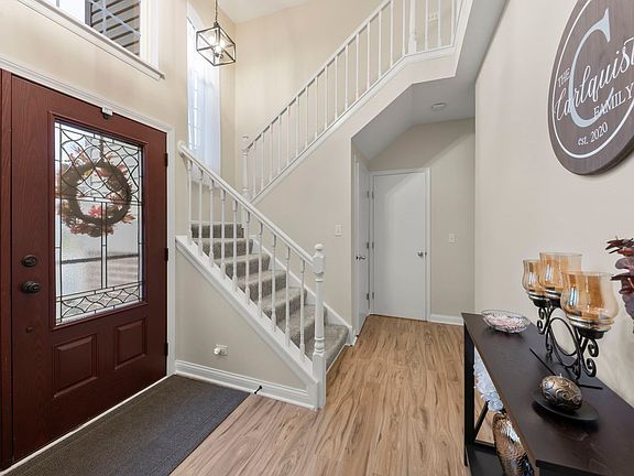 Beautifully updated home with true open-concept living. A bright two-story foyer and 9-foot main-level ceilings set the tone the moment you walk in. New wood laminate flooring installed in 2024 carries throughout the entire first floor, connecting the dining room, kitchen, and family room into one expansive, modern space ideal for everyday living and entertaining. The kitchen features white oak cabinetry, granite countertops, and stainless steel appliances. Upstairs, the primary suite impresses with a cathedral ceiling, walk-in closet with custom organizers, and a stunningly updated bath complete with a high double vanity, stylish tile flooring, and a glass-enclosed walk-in shower. All second-floor bedrooms include brand-new windows and blinds (2025) along with updated carpet (2022). The professionally finished basement offers a custom bar, new vinyl flooring (2021), and a generous storage room. Additional upgrades include a new sliding glass door to the backyard (2025), battery backup sump pump (2023), and water heater (2022). Outdoor living shines with a maintenance-free deck, concrete patio, 18' above-ground pool (2023), and a newer gazebo. All of this in a fantastic location minutes from the park, elementary school, and shopping. This home is truly move-in ready and a must-see!
