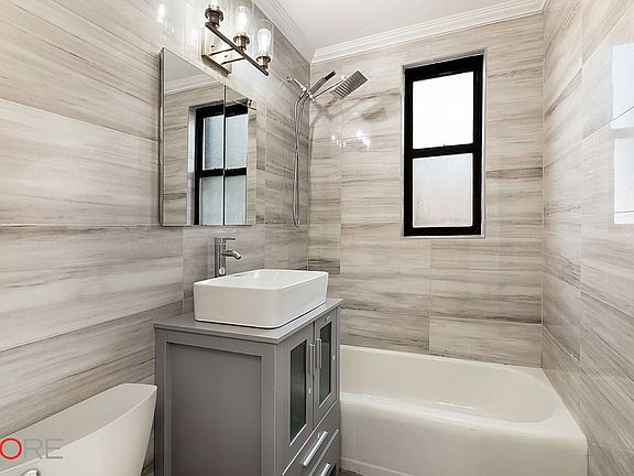The windowed four-fixture bathroom has been completely renovated. The walls are adorned with large-format porcelain tiles, creating a peaceful and calming space.
