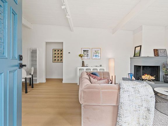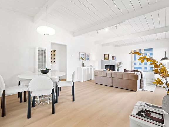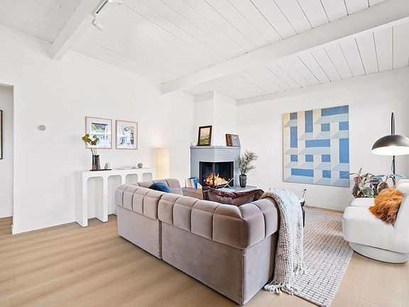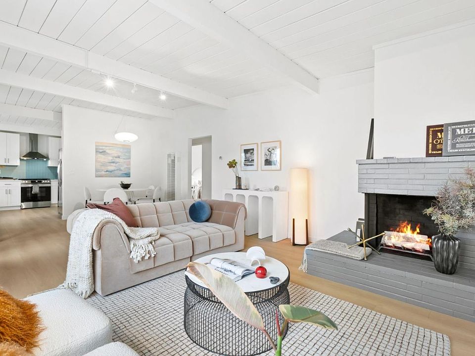 This is midcentury modern at its finest - wood-beam ceilings, cozy fireplace, beautiful bathrooms, primary en-suite complete with walk-in closet, and a kitchen primed for gatherings galore.