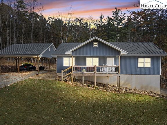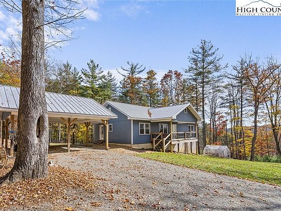Remarkably well maintained move in ready home with +/- 4 deeded acres with a MOUNTAIN VIEW! This inviting home built in 2021 feels new and fresh. The covered front porch offers a lovely mountain view to the side. As you enter the living area, it is spacious and open. The kitchen is gorgeous and features gleaming countertops, a gas range with a beautiful hood. The view from the window in the kitchen overlooks your wooded back yard. Just off the kitchen is a dining area that leads to a covered back deck. What a relaxing space for coffee in the morning or entertaining guests! On each side of the living area there is a bedroom. Both BRs have ensuite BA. The primary BR is large and easily accommodates a king sized bed. There is also a sizeable walk in closet. The primary BA features 2 sinks and a huge linen closet. Off the L side of the kitchen is the laundry area and stairway to the huge basement. There is a 3rd finished BA there, the ceiling and walls are finished. This area could easily be finished off and with the 3 BR septic can handle a need for a 3rd BR, There is also a garage entry in the basement. The garage sq' in the listing is an approximation depending upon how you might divide the space. The tankless water heater is located in the basement. Outside, the home is in wonderful shape with a standing seam metal roof, well maintained vinyl siding and porches for you to enjoy. The detached 2 car carport is connected to the home via a covered walkway. There is an old logging road that will help you find the property lines to the left of the home and the fence line is the border to the right. From here, you are just minutes from the Blue Ridge Parkway, shopping in Galax or Sparta and not far from other trails in the area. Just a few miles down the BRP is the Blue Ridge Music Center. Take a look at this one as it could be a wonderful fulltime residence or a peaceful and secluded mountain getaway!