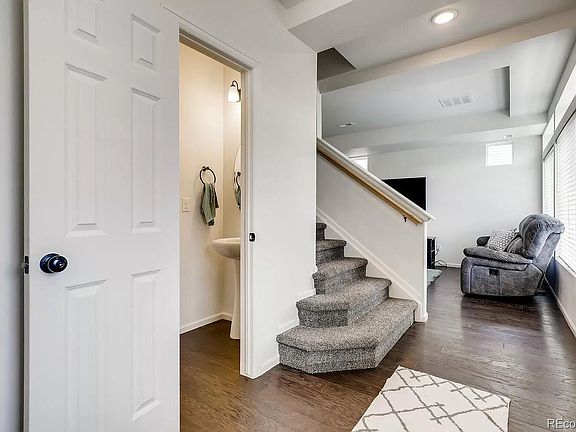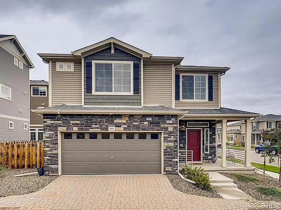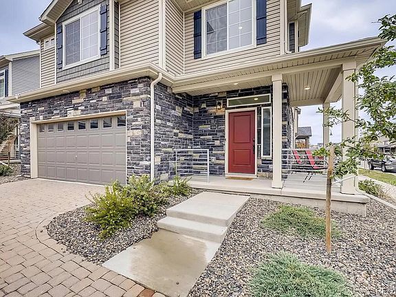 This beautiful light and bright 2 story Randem model Carriage House in Adonea features, 3 bedrooms, 2.5 bathrooms, an open layout living room and kitchen, second story laundry, and a 2-car garage. Upon entering, you will be greeted in your formal entry with hardwood flooring all throughout, coat closet, and 1/4 bathroom. The kitchen boasts white Quartz countertops, Stainless Steel appliances, and a large eat-in island which leads into the living room. The 2nd floor master bathroom suite offers a double vanity, beautifully tiled walk-in shower and large walk-in closet! This home has beautiful finishes and trendy upgrades! The HOA professionally maintains the front landscaping, including snow shoveling! Some exterior features include a fenced backyard with sprinkler system, a covered front porch and a Ring Smart video doorbell. Easy access to I-70 and E-470 highways. A shopping center is planned for just west on Gun Club and it is only 20 minutes to Southlands shopping, as well as Northfield shopping and entertainment!
