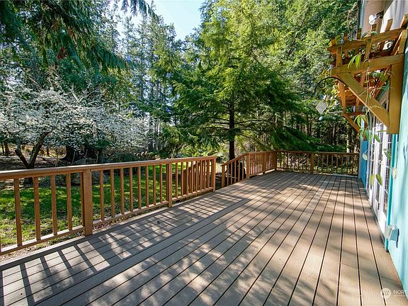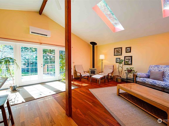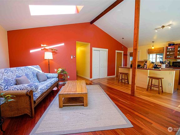 A Single story 3 bedroom 2 bathroom home situated on over half an acre in a quaint Eastsound community. Light and bright throughout, this home boasts an open concept living area with vaulted ceilings and skylights. While the main living area has seamless access through the French doors to a new deck that overlooks the tranquil front yard. The kitchen opens up to the dining and living areas with easy access to the oversized utility room. Both bathrooms have been updated including heated floors, fixtures and surfaces. The hot tub is located on the back deck with easy access from the primary bedroom. The outbuilding is currently being used for an office and storage. All within walking distance to North Beach, Buck Park and Eastsound Village.