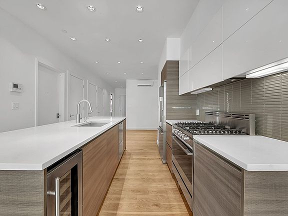 The custom designed kitchen with an island showcases high-gloss white glass cabinetry with soft close hardware, Caesarstone countertops and are accented by wood-grain textured elements The kitchens are appointed with Fisher & Paykel stainless steel appliances which includes a 5 burner gas cooktop, 24 bottle built-in wine cooler and are equipped with a Blanco stainless steel sink and Kohler faucets.