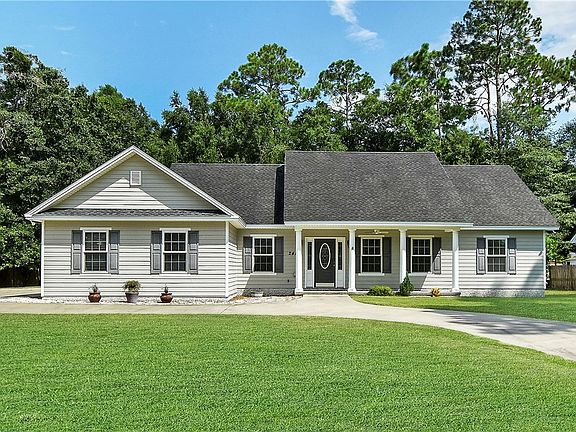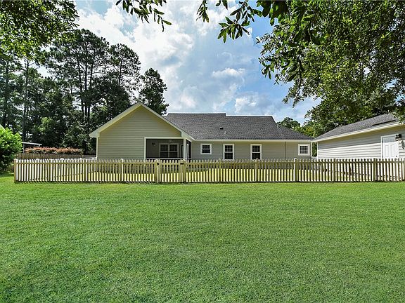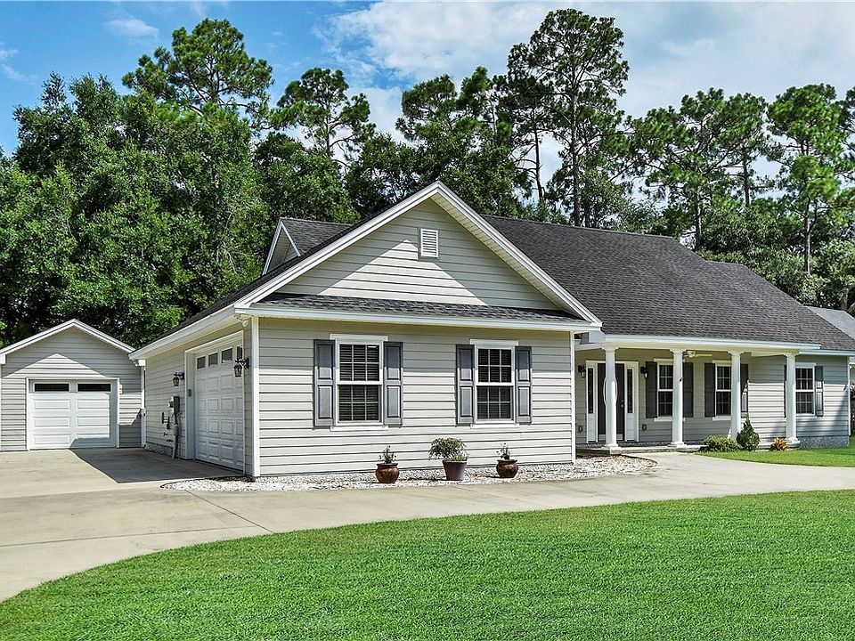 Beautiful, well maintained, one level, 3 bedroom/3 bathroom home is located in Morgans Mill Subdivision in Brunswick GA. This split floor plan has open living/kitchen area, office space, 2 car garage with an additional detached garage/workshop. The kitchen boasts stainless appliances, granite countertops, tiled backsplash, an ample amount of cabinet space, roll out shelves and drawers, & an additional large pantry in hall. On the left, upon entry, Primary bedroom with en-suite bath with two spacious walk-in closets, double vanities, beautiful tiled shower, & make-up/vanity area. Spacious laundry room with built in shelving, laundry sink, & washer/dryer conveys. On the right, two guest bedrooms, one with en-suite bath, also guest bath located in the hall. Enjoy the screened in back porch overlooking the private backyard. Some other features include: Built in bookcases, built in desk, crown molding in main living area, & split ac unit in detached garage. Close to FLETC, shopping, restaurants, beaches & more. Schedule your showing today!