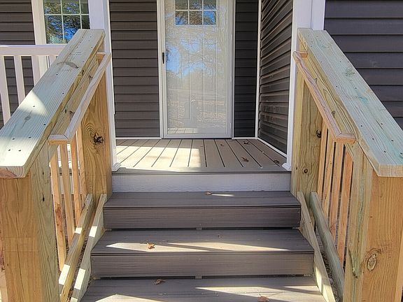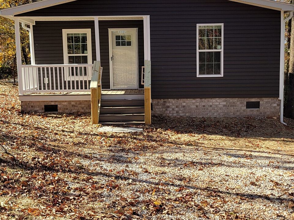 Beautiful New Home Featuring 3 Bedrooms and 2 Bathrooms! Move-in ready with a low-maintenance vinyl and brick exterior, plus a covered front porch with durable composite decking. This open floor plan offers a spacious living area that flows into a large kitchen and dedicated dining space. The kitchen features new stainless steel appliances (including refrigerator), a stainless farmhouse sink, oversized breakfast bar, abundant cabinetry, generous counter space, and a stylish tile backsplash. The primary suite includes a large walk-in shower, dual sinks, and a transom window for added natural light. A very spacious laundry room provides additional functionality and includes a convenient side-deck entrance. Throughout the home, you'll find beautiful flooring, updated fixtures, and ceiling fans in key living areas. Enjoy your morning coffee on the covered front porch or entertain on the side deck perfect for cookouts. Situated on a wooded lot with plenty of parking and NO HOA. Excellent location with easy access to shopping, dining, and major conveniences.