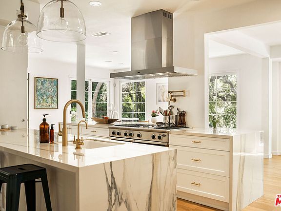 Tucked away among the trees on coveted lower Nichols Canyon Road in the Hollywood Hills, this exquisite traditional residence offers nearly 4,000 square feet of refined living space on an expansive 18,000 square-foot lot. With 4 bedrooms, 4 bathrooms, and a dedicated office, the home balances gracious scale with intimate warmth. A pool and spa are perfectly framed by lush greenery, while fencing ensures the utmost privacy. This magical setting is designed to inspire both serenity and joy. From the moment you enter, walls of glass draw the eye outward to captivating views of nature, where sunlight filters through a canopy of mature trees. The spacious living room features newly installed wide-plank hardwood floors, a fireplace, and a built-in bar. An inviting backdrop for gatherings. Flowing seamlessly into the dining room and a spectacular chef's kitchen, the open-concept design creates an effortless atmosphere for entertaining. Completed in 2022, the kitchen is a dream, with a dramatic waterfall quartz island, professional-grade stainless steel appliances, abundant custom cabinetry, and a cooktop thoughtfully positioned to allow the host to engage with guests.The main-level primary suite offers a private deck with verdant vistas and a luxuriously renovated bath with spa tub, separate shower, and dual sinks. On the lower level, two generously sized bedrooms with private patios are connected by a cozy library nook, while a discreetly concealed 800-bottle wine cellar adds a touch of indulgence. For the ultimate in flexibility, a private upstairs wing includes a guest suite with bath and a gym or office space. Outdoors, the property transforms into a secluded wonderland. Towering oaks, fruit trees, and climbing vines surround the pool and spa, creating an enchanting natural sanctuary where the sounds of wildlife become part of the charm.Peace of mind comes with thoughtful upgrades, including a whole-house generator, roof sprinklers, alarm system, new pool plaster and systems, central HVAC, and a recently replaced sewer line. Just minutes from hiking trails yet nestled in an idyllic setting, this Nichols Canyon retreat is a rare opportunity to enjoy both immersion in nature and proximity to the city. A timeless estate that feels worlds away.