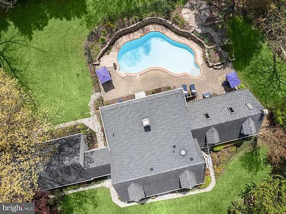 This expansive stone Cape Cod blends timeless elegance with thoughtful updates, offering a spacious layout filled with character and charm. Inside, classic details such as hardwood floors, exposed beams, wainscoting, and stone fireplaces create a warm and inviting atmosphere. The formal foyer is flanked by traditional living and dining rooms, with the living area centered around a stunning stone fireplace. The eat-in kitchen anchors the heart of the home, featuring granite countertops, a generous center island with seating, stainless steel appliances, and an adjoining breakfast area. This space flows seamlessly into the family room, where rich wood paneling, custom built-ins, and a stately double-sided fireplace add depth and distinction. A private library with built-in shelving opens to the sunroom, or pool room through striking bifold wooden doors, offering easy access to the backyard. Two powder rooms complete the main floor. Upstairs, the primary suite offers a peaceful retreat with hardwood flooring, multiple closets, a yoga nook, an office, and a luxurious en-suite bath. Three additional bedrooms and a full bath round out the upper level. The lower level includes a laundry room, fitness or recreation area, and a flexible workshop or storage space. A breezeway leads to the detached two-car garage, while a separate barn with electrical offers the perfect space for a workshop or studio. The beautifully landscaped grounds surround an inviting in-ground pool and patio, creating a private outdoor escape perfect for relaxing or entertaining.
