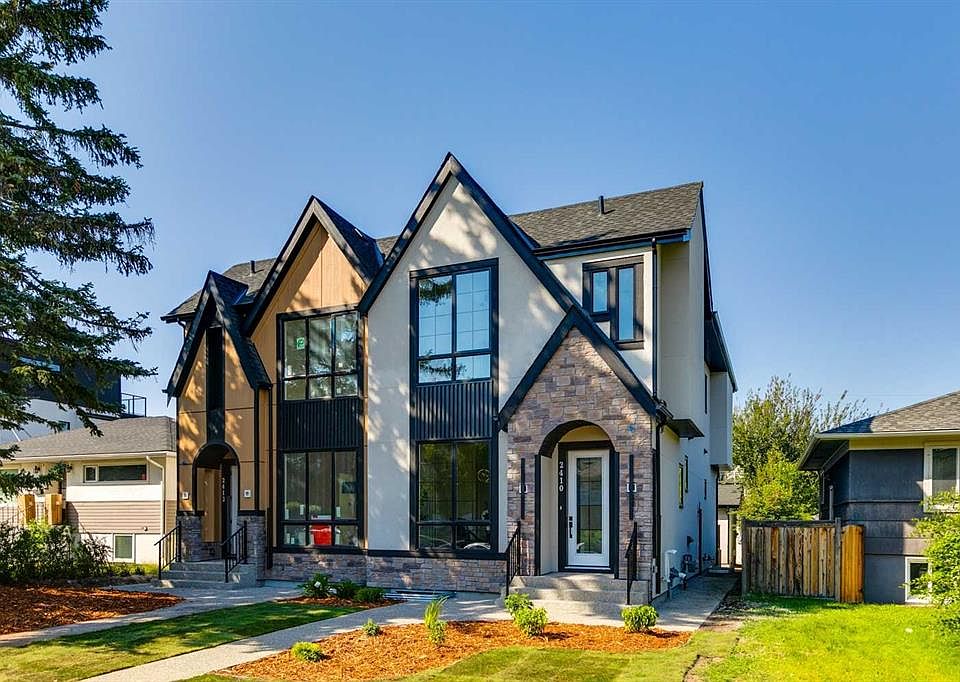 Gorgeous new 3 bedroom home built by Royal Design Homes on a quiet cul-de-sac in sought after Richmond, offering over 2000 sq ft of living space plus a self contained legal 2 bedroom basement suite. The bright & airy main level presents engineered hardwood floors, high ceilings & stylish light fixtures, showcasing the front dining area with beautiful feature wall & ample space to host family & friends. Create culinary masterpieces in the kitchen that’s tastefully finished with contrasting quartz counter tops, large island/eating bar, excellent appliance package, including panelled fridge & plenty of storage space, including a lovely built-in banquette. The living room is anchored by a floor to ceiling feature fireplace & built-ins. A cozy office space is tucked away just off the kitchen, perfect for a home office setup. Completing the main level is a convenient mudroom with bench, hooks & storage & a 2 piece powder room with wall paper accent & raised stone sink. Ascend the lighted staircase to the second level that hosts a loft/bonus room, 2 bedrooms, 4 piece bath & laundry room with sink & storage. The primary bedroom with vaulted ceiling boasts an outstanding walk-in closet & posh 5 piece ensuite with dual sinks, make-up vanity, relaxing freestanding soaker tub & rejuvenating steam shower. The fully contained legal basement suite features engineered hardwood floors, a large living/dining area with tons of built-in storage, kitchen with island/eating bar, quartz counter tops & stainless steel appliances. Two bedrooms, a 4 piece bath & dedicated laundry facilities complete the legal basement suite. Other notable features include roughed in air conditioning & 2 furnaces. Outside, enjoy the beautifully landscaped front garden & back yard with deck & access to a double detached garage. The location is incredibly convenient, close to vibrant Marda Loop, excellent schools, parks, public transit & easy access to 26th Avenue & Crowchild Trail.