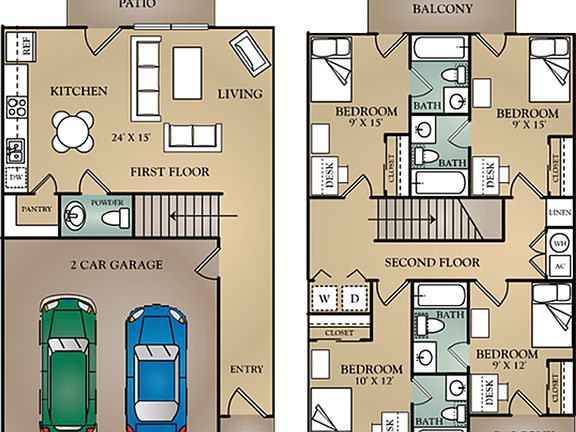 Modern townhouse just minutes from campus. Each bedroom has a private bath, plus a guest half bath. Open living space, laundry in unit. Amenities include a gym, pool, and secure parking.