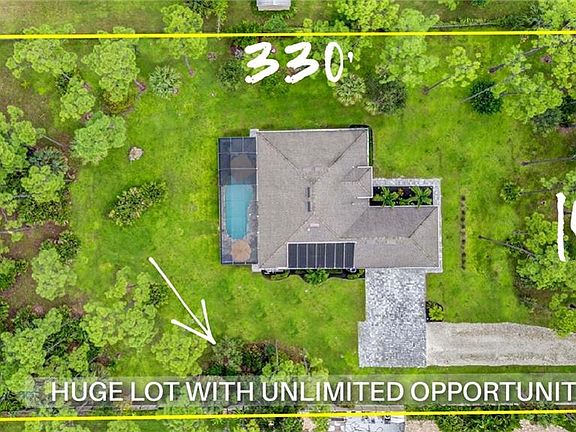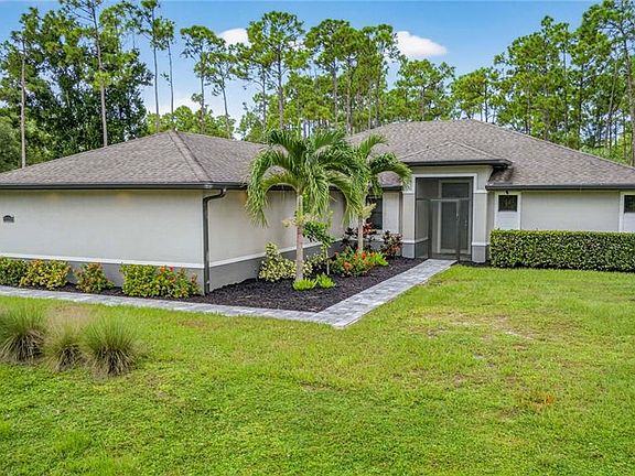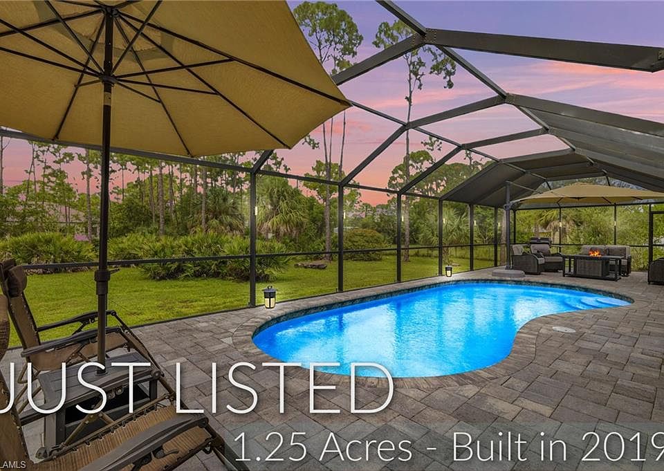 NOTHING COMPARES TO CLAIRE!! Rare offering of a beautiful, 2019 constructed, 4 Bedroom, 3 bath, 3 car garage, pool home set on a totally usable, 1.25 Acre upland property for the low $900's!! Features of this beautiful home include, wide open great room floor plan, super high ceilings, SPECTACULAR 8FT TALL CORNER POCKETING SLIDERS off the family room, large kitchen with soft-close custom cabinetry featuring pull-outs, level 2 granite counters, stainless steel appliances, 5-person counter height bar with tiled accent wall, beautiful backsplash, coffee bar and more!! Additional features include tile throughout all living areas, tray ceilings, crown Moulding, huge master suite with 2 BIG walk-in closets and fully upgraded en-suite bath highlighted by a gorgeous 2-person walk-in-shower with frameless glass door and rain showerhead; 3 large guest bedrooms, fully upgraded guest bath, convenient pool bath, custom tv wall niche in family room, upscale fans and light fixtures, SUNNY WESTERN "SUNSET" REAR EXPOSURE letting in plenty of natural light, separate laundry room with tub, whole house water filter and more!! Outdoors enjoy a huge 3 CAR GARAGE with extra storage and insulated garage door, large covered lanai, sparkling temperature controlled solar heated swimming pool, wonderful pool cage with new screening and integrated lighting, outdoor shower, pre-plumb for outdoor kitchen, 50 AMP outlet for future generator plug, FULL LENGTH ELECTRIC ROLL DOWN HURRICANE SCREEN ON LANAI, whole house surge protector and more! As for the property, enjoy 1.25 acres of beautiful, wonderful, private land!!!! The opportunities are limitless; toy barns, sports courts, cabanas, workshops, storage for your boat or RV; you name it and it can be done!! This home is located in the "HOT" neighborhood of San Carlos Estates made famous by its close to everything location and 1+ ACRE lot sizes!! Have your toys, golf carts, etc. with NO HOA AND NO FLOOD ZONE!! Enjoy close proximity to Downtown Bonita Springs and the areas best beaches, restaurants, shopping, entertainment and all that SW Florida has to offer!! Call for your private showing today!!