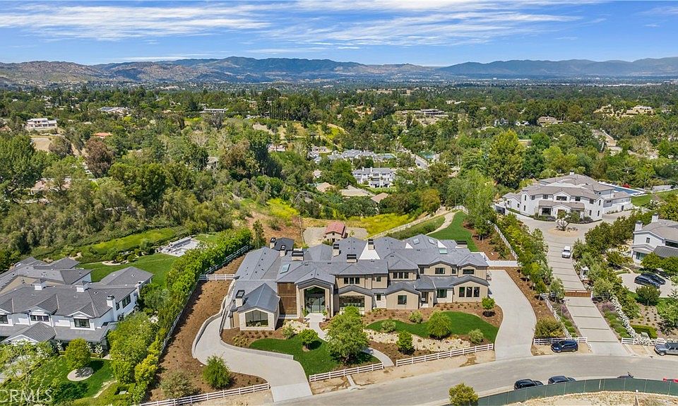 Welcome to "The Ridge at Hidden Hills". This new, absolutely spectacular, one-of-a-kind estate is nestled at the end of a quiet cul de sac and is sited on a beautiful 1.77 acre view lot. Step through the custom 12’ glass pivot door and enter into a world of luxury, elegance, and quality. Bathed in natural light, and spanning 21,670 square feet, this home exemplifies the essence of the relaxed, indoor/outdoor California lifestyle. Highlights of the spacious open floor plan include a gorgeous, three level floating staircase, stellar, restaurant quality chef’s kitchen (and prep kitchen), entertainer’s center island with counter seating, and big breakfast room, all open to the large family room with motorized, sliding walls of glass, two-sided fireplace, and adjoining living room with lounge and seating bar. Additional amenities include a formal dining room with refrigerated wine wall, adjoining butler's pantry, and a full catering kitchen, plus a large private office with full wall windows, a stunning home theater with fabric covered acoustic sound walls, and wonderful gym & spa complete with massage room, steam shower & sauna. There are six generous en suite bedrooms, four upstairs and two on the main floor, all serviced by an elevator. The superb primary suite offers a sitting area, fireplace, deluxe bath with dual showers and big soaking tub, enormous, room sized custom closets, and a large private balcony showcasing the expansive pastoral views. One of the two downstairs suites is a second primary suite with a soaking tub, covered patio, and its own private entrance. The basement space is a world of its own with a huge game room/lounge, a two lane bowling alley, and garages for 10 cars, showcased by gleaming epoxy floors, plus there's an additional 4 car garage on the main level. The spacious grounds include a sparkling, zero edge infinity pool & spa, three covered patios complete with a full barbecue center, two fireplaces, a powder bath, outdoor bath & shower, and expansive grass lawns. There are also plans for a guest house. This trophy property is located on one of the finest streets in all of Hidden Hills, and close to highly regarded public & private schools, and The Commons shopping center.