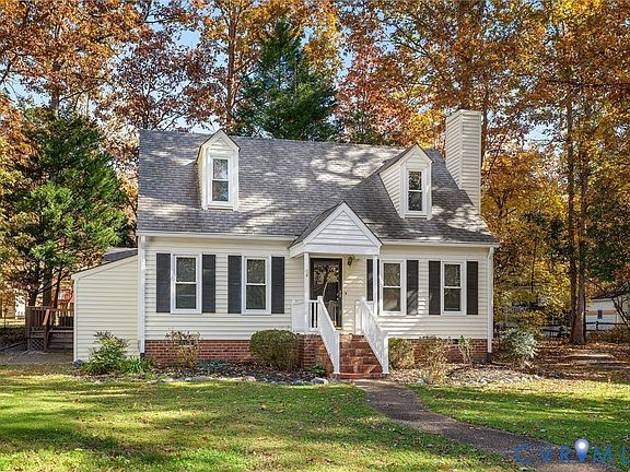 Welcome home to this well-kept cape in beautiful Brandermill. This home has been deep cleaned and is ready for new owners. This home has curb appeal galore with a covered front porch that keeps you dry on rainy days. Inside the family room features laminate flooring, built in book cases and a wood burning fireplace. The formal dining room is ideal for entertaining or quiet meals. The kitchen features smooth top electric cooking. There is a bedroom downstairs with two closets. One closet can be re-opened to connect to the downstairs full bathroom if you would like to create a first-floor primary. There are two additional rooms on the first floor that could be used as offices, a TV room, craft Room, or whatever your heart desires. There is a deck and a patio and an attached shed. Upstairs are two good-size bedrooms with walk-in closets, ceiling fans and lots of natural light. One upstairs bedroom has direct access to the upstairs bathroom making it an ideal primary bedroom. The seller upgraded the ductwork upstairs so that the bedrooms could stay nice and comfortable even on the hottest summer day. The backyard features a lattice privacy screen. This home is conveniently located near the Brandermill walking path, restaurants, entertainment, shopping and Powhite Parkway. You do not want to miss this lovely home.