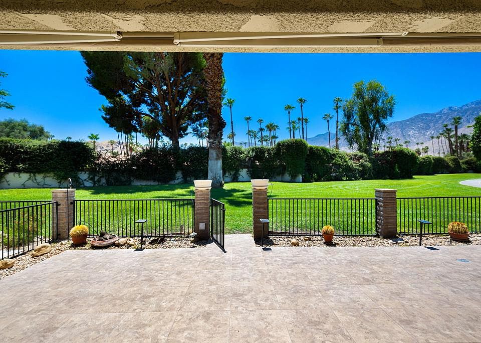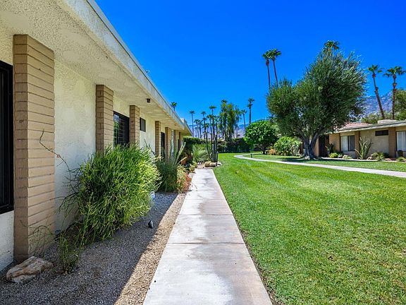 Nestled in a prime location with breathtaking mountain views, Sunrise East situated on fee land is renowned for its low-density design and exceptional amenities, including six pools & spas, two tennis courts, and four pickleball courts. Spacious renovated kitchen with abundant cabinet space, granite counters, and large windows for natural light. The spacious living room features a custom fireplace surrounded by built-in custom lit shelving. The expansive primary suite with mountain view and skylight providing natural light in the renovated ensuite bathroom. A generous second bedroom with renovated ensuite bath. The third bedroom, currently used as a den with expanded space where the atrium used to be and large skylight, can either be converted back to a bedroom or enjoy the currently expanded den and office area adding additional living space. Step onto the fenced large patio off the living room with retractable awning to enjoy magnificent Southwest views of the San Jacinto Mountains and the lushly landscaped grounds. The two-car garage, with direct access to the unit, has lots of storage space, laundry area, and skylight. Mature citrus trees and verdant greenbelts frame the property. Experience the best of Palm Springs living in a home that perfectly balances tranquility, convenience, and timeless style. Don't miss this exceptional opportunity to experience resort-style living at its finest.