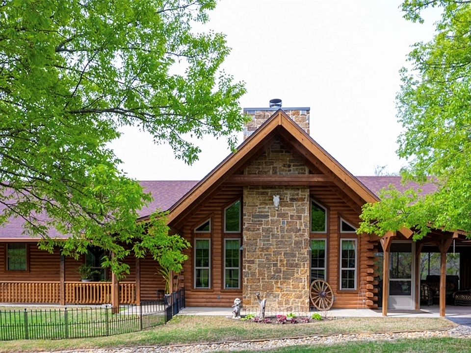 High-end fireplaceCustom log homeRefreshing inground poolScattered oak treesExpansive wrap-around porchesScreened outdoor areaPipe and crossed fencing