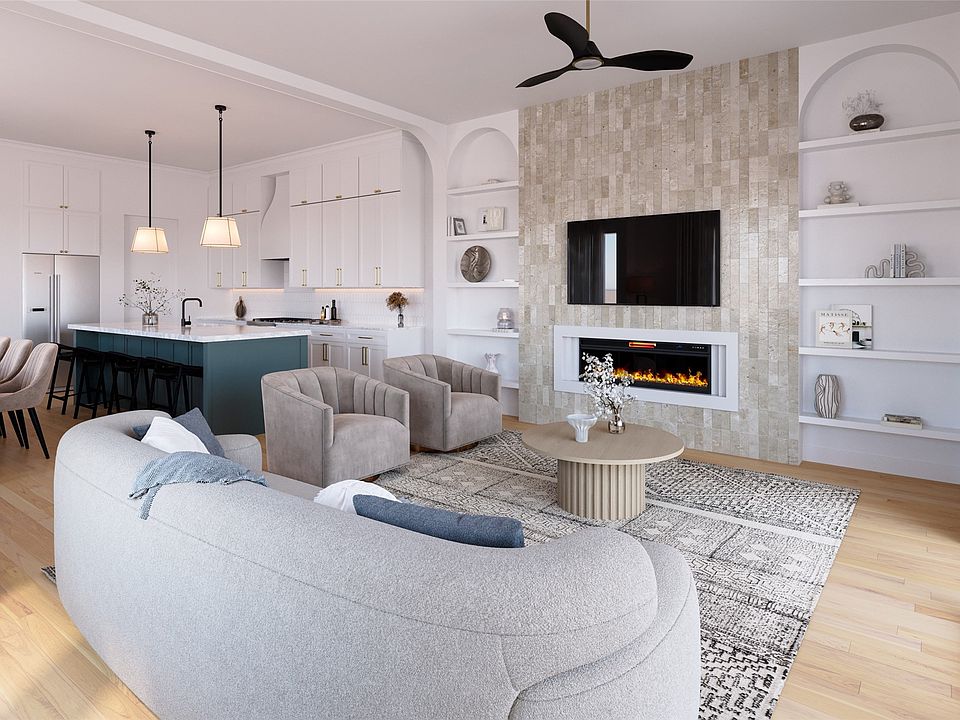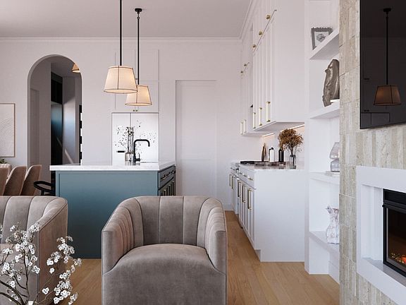 Inside, a light-filled open layout showcases wide-plank flooring, curated finishes, and a sleek fireplace that anchors the main living area. The chef’s kitchen includes custom cabinetry, premium appliances, and a spacious island designed for both entertaining and everyday comfort.