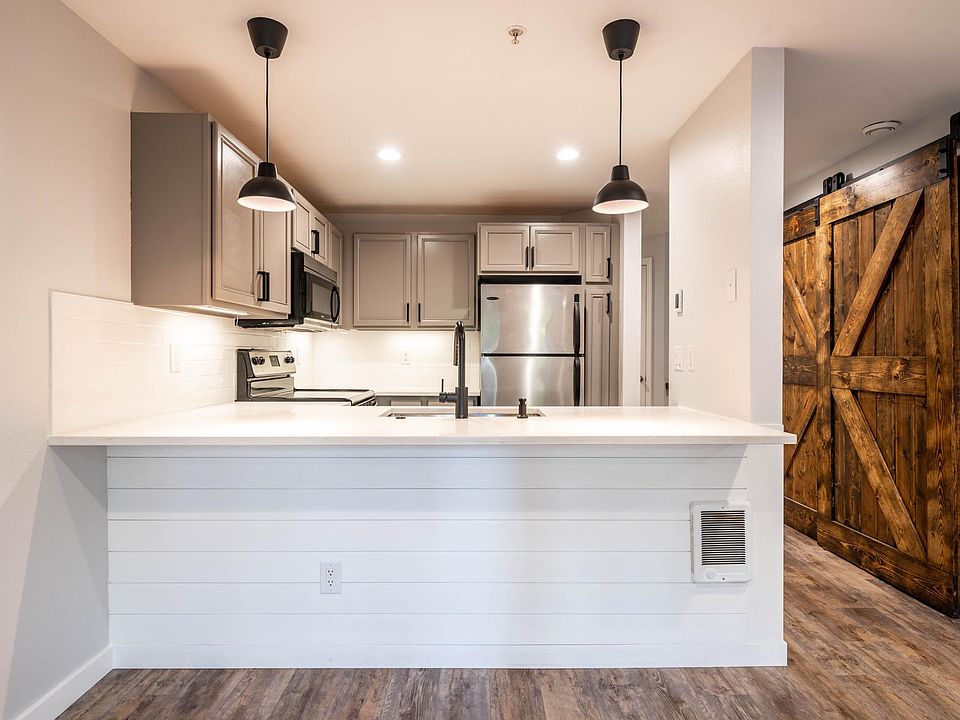 Includes an attached one-car garage with two dedicated parking spots in front of the unit, plus plenty of guest parking! Unit is renovated and features a huge walk-in pantry with barn doors. Stainless steel appliances included: range, microwave, dishwasher, and refrigerator. In-unit washer and dryer provided.