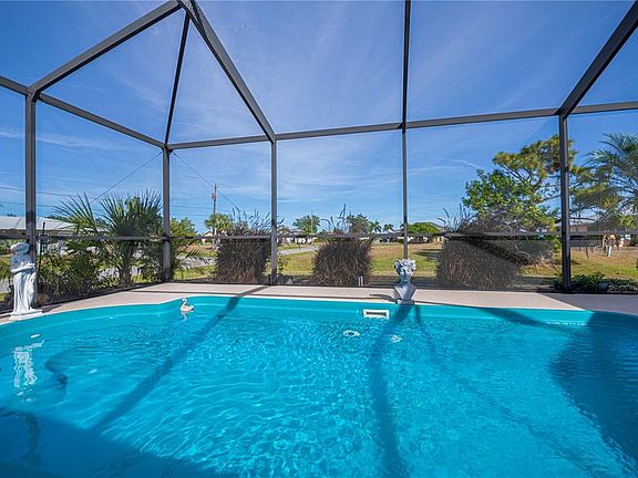 EXCEPTIONAL 3-Bedroom, 2-Bathroom POOL HOME with SOLAR SAVINGS on a PRIME CORNER LOT in Deep Creek! Situated on a custom corner lot with an EXPANSIVE GREENBELT, this extraordinary home in the highly sought-after deed-restricted community of Deep Creek boasts phenomenal curb appeal and ENERGY EFFICIENT SOLAR SAVINGS! The tropical landscaping and unique brick exterior accents complement the concrete curbing and soaring covered entryway, featuring double doors with stunning stained glass inserts that open to a grand foyer. Step inside to a spacious great room with 12-foot ceilings, ELEGANT COLUMNS AND ARCHWAYS, neutral décor, and tile flooring THROUGHOUT the home. Abundant natural light fills the space through sliders leading to the lanai and pool. A separate formal dining room offers ample space for entertaining in this 2000+ square foot open concept home. The well-appointed kitchen is a CHEFS DREAM, featuring wood cabinetry with accent lighting, granite countertops, a stylish tile backsplash, a full pantry, a convenient breakfast bar, and a scenic breakfast nook overlooking the oversized backyard, pool, and lanai enjoying coffee or your favorite adult beverages. The generous primary suite provides TRANQUIL POOL/LANAI/GREENBELT VIEWS, a large walk-in closet, and a private bath with dual vanities, a JETTED GARDEN TUB, and a LUXURIOUS ROMAN SHOWER. The thoughtful split floor plan ensures privacy for all with two full sized guest bedrooms and a beautifully appointed middle bathroom shared with the rest of the home. Enjoy swim time day or night in the large screened pool with ample sunning area and a covered lanai perfect for relaxing or entertaining with friends, family or neighbors. Easy care cool deck also provides low care effort and comfort for those barefoot enthusiasts. Recent upgrades include: *New roof (2023) *Hurricane impact windows and sliders *New hot water heater (2024) *New pool pump (2023) *10” granite window sills *New A/C system *Inside utility/laundry room with wall closet Additional features include a no flood X zone designation. With public sewer, and public water, this home offers carefree Florida living in one of Deep Creek’s most sought-after locations. This is the Florida lifestyle you have been dreaming of year round or a wonderful winter escape ready for you to start enjoying now. Close to dining, entertainment, beaches, Sunseeker resort, downtown historic Punta Gorda, I-75, PG Airport and in a nice deed restricted community with low yearly hoa providing a wonderful blend of comfort, security, and value. Don’t miss your opportunity to own this gorgeous retreat and enjoy the best of Deep Creek living, this Extra Special POOL HOME with NEW SOLAR is priced to move quickly, schedule your showing TODAY!