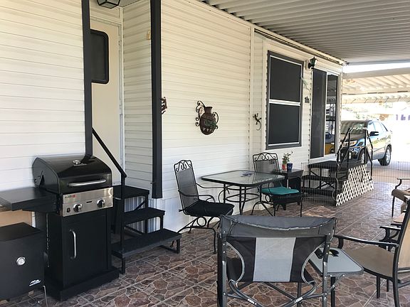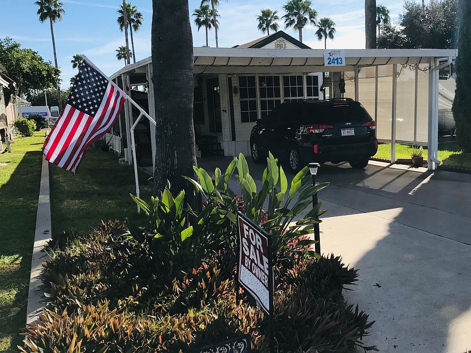 Cozy home for couple or single looking for a winter home to escape the cold up north! Furnished Park Model+land, Covered patio with tiled floor, 2 car carport and 2 additional off street parking spaces, shed with washer/dryer, freezer, small refrigerator, Inside home includes Range, Microwave, Refrigerator-freezer. Yard with sprinkler. Lot included and deeded. Gated Community 55 + with many amenities!