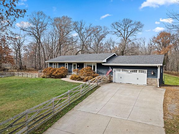 Welcome to your Home Sweet Homestead on 6.5 acres of privacy with a pond and trails throughout! Gated, concrete driveway and huge, fully fenced in front yard for safe playing. Home was fully renovated in 2016 and offers open concept with updated flooring, quartz counter tops in kitchen, updated cabinetry and light fixtures throughout, tiled floors and marble counters in bathrooms, heated floors in main level bathroom and paint throughout. New microwave, stove and refrigerator in 24/25. New Washer/Dryer 2021. 3 Bedrooms on main level including a Primary that walks through to large bathroom. Additional washer/dryer hook ups in main level bathroom closet for main level living! Lower level holds additional huge primary bedroom with walk in closet, walk through to another full bathroom and walks out to patio. Oversized 5th bedroom also walks out and could be used as office, work out or craft room! Cozy family room for all of your relaxing and entertaining needs! Large deck with spectacular views for those amazing summer nights and BBQ's! Oversized garage freshly painted with cabinets for additional storage and a garage fridge. New roof in 2023. New well pressure tank in 2024. Charming 12x8 storage shed added in 2021 for additional outdoor storage needs. This is the one you have been waiting for- schedule your showing TODAY!