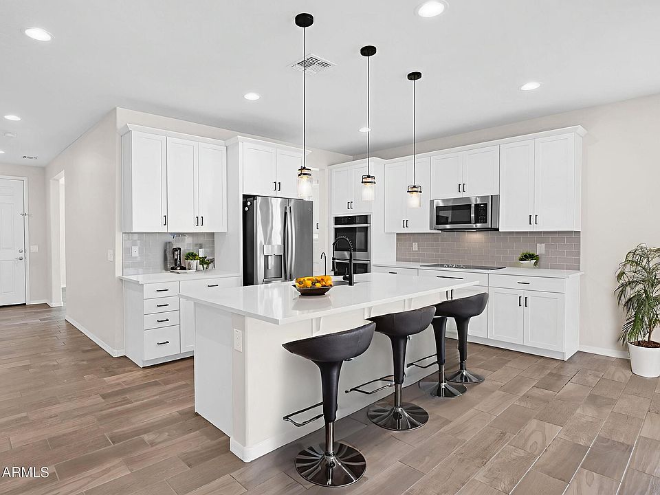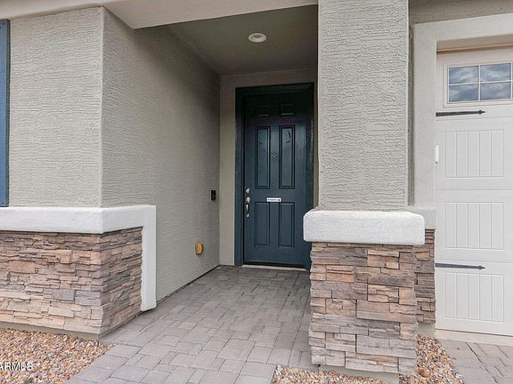Nestled on a desirable corner cul-de-sac lot, this beautifully designed single-level home impresses from the start with low-maintenance landscaping, stacked stone accents, an extended paver driveway, plus a handy RV gate on one side and a single gate on the other. Inside, you'll find wood-look tile flowing throughout the home (with carpet in the bedrooms), soft greige walls, and abundant natural light. The show stopping gourmet kitchen takes center stage with white cabinetry accented by sleek black hardware, quartz countertops, stainless steel appliances with double ovens, a stylish tile backsplash, and a spacious butler's pantry. The open living space offers a cozy electric fireplace, while a versatile flex room offers endless possibilities for a home office, playroom, or hobby space. This home features a desirable split floorplan with the primary suite tucked privately at the back, complete with its own ensuite bathroom and a large walk-in closet. You'll actually enjoy doing laundry in this laundry room, showcasing decorator touches, a built-in sink, mosaic tile backsplash, shiplap accents, and cabinetry designed to make daily tasks a little more enjoyable.
