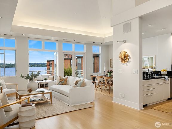 Coveted opportunity at Madison Point. This top-floor penthouse w soaring ceilings captures stunning views of Lake Washington. Light-filled interiors flow effortlessly, featuring double French doors to two private balconies, chic hardwoods & a stylish fireplace. Open-concept living spaces perfect for entertaining. The primary suite is a true retreat w a deep jetted tub, vanity, walk-in closet & a charming bay window w a cozy alcove overlooking lush greenery. Enjoy gated entry, two secure parking spaces & access to the private community dock. Rarely available, the boutique building offers an elevated lifestyle in the heart of Madison Park. Close to vibrant shops, cafés & parks — experience the best of lakefront living!