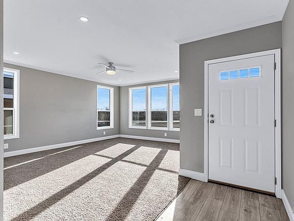 Welcome to your new home! This remarkable and roomy contemporary ranch floor plan is nestled on a residential lot, with open space just across the street , providing a picturesque setting with views of the mountains. As you approach, you'll be greeted by a covered front porch, setting the tone for the charm that awaits inside. Once inside, the house unfolds into an inviting open floor plan, perfect for entertaining guests. The kitchen, a true focal point, is a dream come true. It boasts a sizable island and breakfast bar, adorned with stylish pendant lights. The sleek glass hood vent adds a modern touch, complemented by a tasteful backsplash and under-cabinet windows that bathe the space in natural light. Stainless steel appliances. Ample cabinets and counter space, built-in nooks, and a floating shelf provide both style and practicality. Three generously sized bedrooms and two baths, with the master suite take the center stage. The master suite not only offers a walk-in closet but also a versatile retreat that can serve various purposes, whether it be a cozy reading nook or a personal office space. The well-appointed 4-piece master bath is a sanctuary in itself, complete with a spacious shower featuring a glass door, a double vanity, and a linen cabinet. What's more, this home is not just beautiful but brand new, ensuring modern comfort and style. The peace of mind that comes with a 1-Year Builder warranty adds the final touch to this perfect living space.