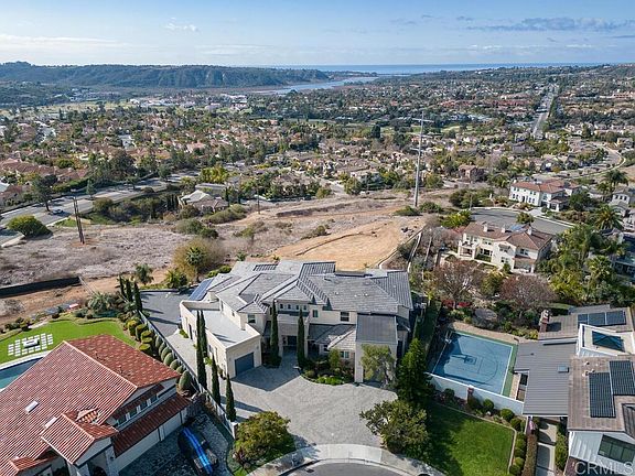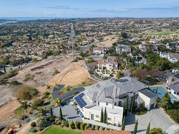 STUNNING UNIQUE LA COSTA BEAUTY ON 1.23 ACRES WITH LAGOON & OCEAN VIEWS!! Totally custom fabulous entertainers home newly built in 2018 with extra large lot and vacant land/pad, also NO HOA OR MELLO ROOS. Home includes a huge 1,200 sf walk-in attic and the Solar system is owned with no lease. Beautiful open floor plan, single story living with entry and all major rooms on the main level. Soaring great room with open beam 22' ceiling, gas heat producing fireplace & custom Bi-Fold La Cantina door opening to sparkling vanishing edge pool, jacuzzi & patio, all with expansive ocean views. Fabulous cooks kitchen custom built with extra large quartz island, built-in fridge, vegetable sink, built-in ice maker, spice pull outs, trash drawers, tray racks & walk-in pantry. 4 Bed, 4.5 bath all with ensuite baths. Upstairs game/flex room with view balcony perfect for company or home office. Almost all the rooms in home are flooded with light and overlook the lagoon/ocean. Beautiful engineered hardwood flooring & all baths done in tile, marble & quartz with quality fixtures. Oversized primary suite with open beams and stack stone gas-heating fireplace. Amazing primary bath with heated floors, walk-in shower, all marble, tile & quartz countertops, his/hers toilets and extra large walk-in closet. Second downstairs primary can serve as an office or guest quarters. 3-Zone Heat & Air and all rooms have ceiling fans. 2 separate garages, make up 3 garage parking spaces with one garage built to accommodate a future car lift. EV charging installed. Sparkling vanishing edge pool, jacuzzi, waterfalls, outdoor fire ring, BBQ with sink & fridge all encompassed within a large expansive paver patio. Very low maintenance yard with artificial turf and drip irrigation on timer. Large lower pad area with all utilities run for future development. Property includes a Recorded Easement for maintenance from Amber Lane that goes with the property allowing for additional access. Custom glass fencing to take in lagoon, ocean & Omni golf course view. Custom paver driveway and easy maintenance concrete tile roof and all stucco walls/eaves to be termite and fire resistant. Never fear about where to store all your extra belongings in the 1,200 sq. ft. walk-in attic, ready to use and could potentially be improved to usable space. Perfectly situated close to shopping, freeways and the beach. Excellent schools and nice quiet neighborhood at the end of a cul-se-sac with quick access to major roads. Western facing back of home displays amazing views, sunsets and gorgeous twinkling night lights. Fourth of July fireworks displays multiple fantastic fireworks displays as you toast your s'mores over the built-in fire ring. Don't miss the opportunity to tour and own this one of a kind home!