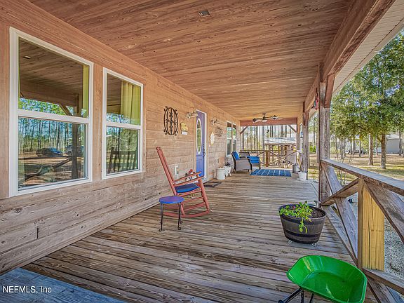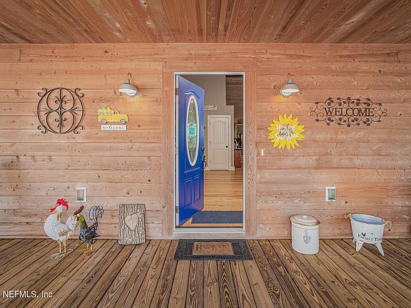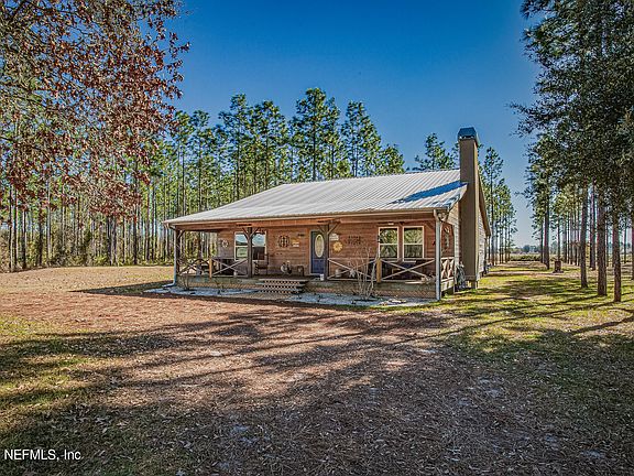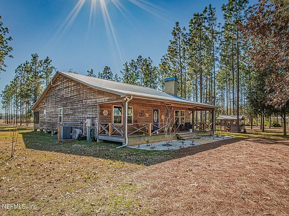 Secluded beyond a pine forest is a welcoming cedar home located in Hilliard on over 10 acres. As you follow the winding driveway surrounded by nature's beauty you will see a lovely covered front porch where you can imagine yourself sitting and relaxing with your morning coffee. Entering the home your eyes are drawn to the vaulted pine ceilings and pine flooring throughout. Enjoy the fireplace with this open concept living room, dining area and kitchen. Kitchen has beautiful white cabinets, breakfast bar, movable island, pantry and stainless steel appliances. Master suite has a large walk in closet, double vanity, and walk-in shower. Plenty of storage closets throughout the home. Large laundry room has room for a freezer and a deep sink. Find a slice of heaven on the spacious screened back porch with a bar, perfect for entertaining. Spray foam insulation under house. 26x40 2-car detached garage with power. 22x30 metal barn with power. Tankless hot water heater. Land is Ag Exempt.