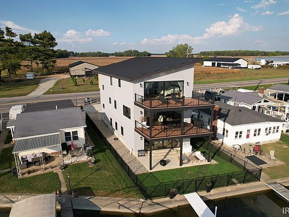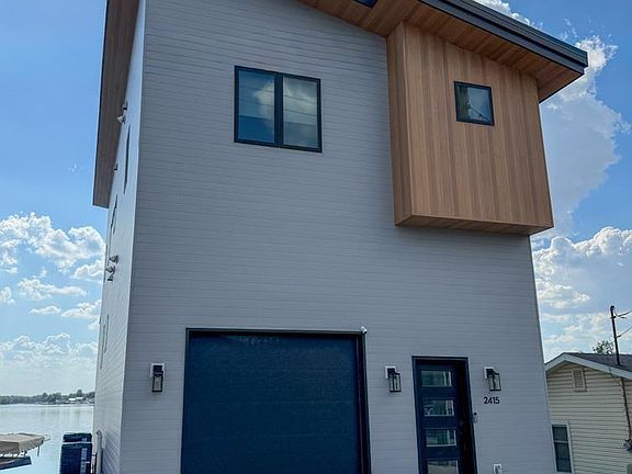 Lake Life, Redefined: Modern Waterfront Living. Discover true sophistication in simplicity with this stunning custom-built home on Lake Manitou. This 4-bedroom, 3.5-bathroom residence redefines modern waterfront living with its bold, clean lines and minimalist design. This home was meticulously designed to capitalize on breathtaking lake views from every floor. The striking architecture, with its single-slope roof and expansive Marvin windows, including 16’ patio doors, blur the lines between indoor and outdoor living. The minimalist Vesta plank steel siding and Fiberon composite decking not only provide a clean, modern aesthetic but also offer superior durability and a maintenance-free lifestyle. Inside, the open-concept kitchen is a chef’s dream with its waterfall quartz countertops, stainless steel appliances, and walk-in pantry. A lower-level family room, complete with a built-in ice machine and wine fridge, is the perfect spot for unwinding after a day on the water. Relax and recharge in the luxurious primary suite, offering a third-story walk-out deck with indescribable lake views, a spa-like ensuite with a large tiled shower and double vanity sinks, and a spacious walk-in closet. Another bedroom offers its own ensuite bath and walk-in closet, providing comfort and privacy for guests. Practical features include durable porcelain tile plank flooring throughout, dual zoned HVAC systems, a heated and cooled single-car garage with impressive 14.5’ ceilings, and functional finished storage space. This home is not just a place to live—it's a statement of contemporary style, expertly built for a sustainable future. Experience waterfront living, elevated.