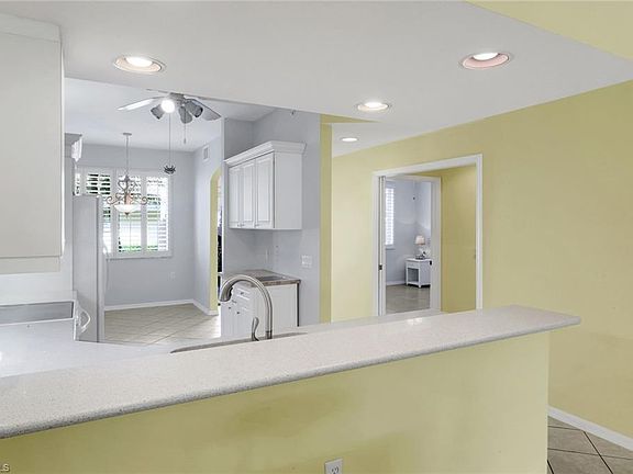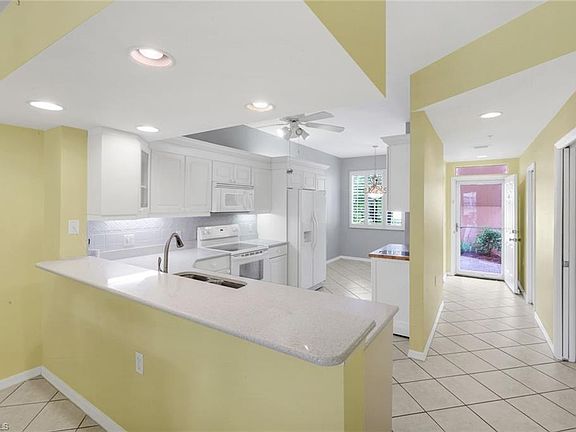 FIRST FLOOR Lakeview condo located on a Premium Cul De Sac. This provides a very private and quiet environment with no traffic. Discover serene living in this beautifully appointed 2-bedroom, 2 -bath split bedroom floor plan. Enjoy tranquil lake views from over 300 square feet of extended space thanks to a fully ENCLOSED LANAI with glass sliding doors-perfect for year-round relaxation or entertaining. The summer kitchen has a full set of base and overhead cabinets, sink and refrigerator to complete this great space. The kitchen features white raised panel cabinets, quartz counters and white appliances. The open-concept layout has tile throughout with abundant light. The master suite has a tray ceiling, plantation shutters, sliding doors leading to the lanai and the bathroom has a new rain glass shower enclosure with a new tile floor, dual sinks, walk in closet and linen closet. Detached one car, 12'x24' garage offers ample parking and storage. This condo offers the perfect blend of comfort, style and peaceful surroundings. Whether you are seeking a seasonal retreat or a full-time residence, this home delivers exceptional value and lifestyle. To add to the Falling Waters lifestyle are the amenities. The largest saltwater community pool in SW FL, 11,000 sf with tropical landscaping and connected to a clubhouse that provides many activities. Enjoy a round of tennis with friends on the clay tennis courts. The bocce courts offer a place to play a fun sport with new neighbors in many of the seasonal bocce leagues. Falling Waters's ideal location provides a 4.5-mile direct drive to the shops and fine dining offered on 5th Ave & Third Street in downtown Naples and the the beaches of the Gulf.