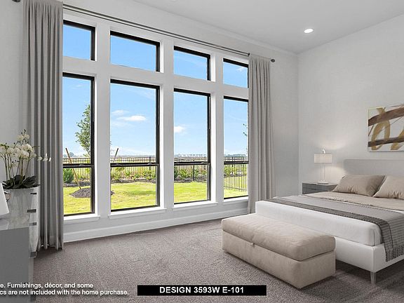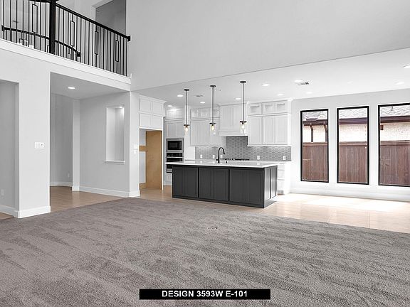 Two-story entry features curved staircase. Formal dining room and home office with French doors frame entry. Two-story family room with wall of windows opens to kitchen and morning area. Kitchen features walk-in pantry, Butler's pantry and island with built-in seating space. First-floor primary suite includes bedroom with 12-foot ceiling and wall of windows. Dual vanities, corner garden tub, separate glass-enclosed shower and two walk-in closets in primary bath. A second bedroom is downstairs. A game room, Hollywood bathroom and secondary bedrooms are upstairs. Covered backyard patio. Mud room off three-car garage.