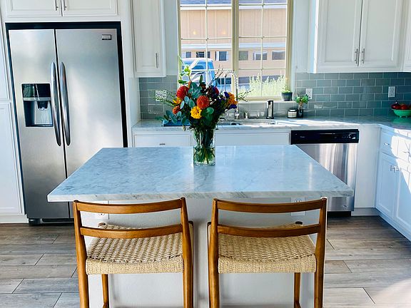Bright and fully equipped with cookware, utensils, dishes, microwave, and coffee maker. The kitchen includes a large marble island with bar seating, plus a window side breakfast table.