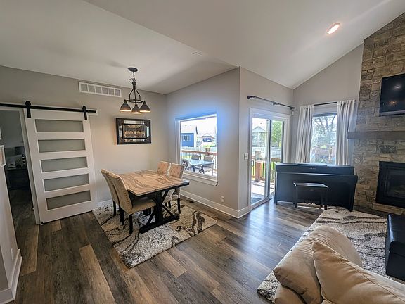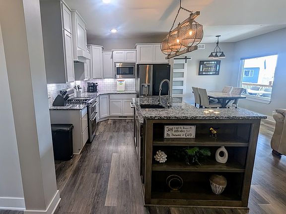 Stunning custom features paired with an open floor plan and tasteful, timeless design add up to one gorgeous home! Immaculate care and pride of ownership show in this 5BR 3BA 3CAR ranch style home with 3,052 sf situated on a large fenced lot. The kitchen, living and dining spaces are harmonious as the heart of the home, making entertaining and everyday life a breeze. Design features include symmetrical vaulted ceiling, floor-to-ceiling stone fireplace, a wall of windows for natural light, spacious island and eating bar, granite counters, upgraded appliances, walk-in pantry, and drop zone with separate laundry room. The split BR plan provides a primary retreat w/dual vanity, jetted tub, 5 ft shower, water closet and walk-in closet. Two more BRs and guest bath complete the main level. The basement is finished with a family room, 2 more large bedrooms with walk-in closets, and 3rd bathroom. Lots of storage under stairs and in 7x33 mechanical room with built in shelves. Play and relax outdoors with covered deck, large patio below, stamped concrete sidewalk through dual-sided garden zones, concrete-anchored 12x16 custom outbuilding, quality playground and trampoline! Other amenities: High-efficiency HVAC, water system (softener/purifier/reverse osmosis), radon mitigation, irrigation well, sprinkler system, garden beds w/drip lines, Ring doorbell + exterior cameras, garage door openers and exterior LED light strips. Southwest Passage neighborhood has a small-town feel just on the outskirts of Wichita in the Goddard school system, yet close to all conveniences.