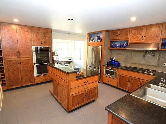 Kitchen has commercial-grade stainless steel appliances, granite countertops, a pot filler over the stove, trash compacter, custom wine rack, island, plenty of cabinet storage, and tile floors.